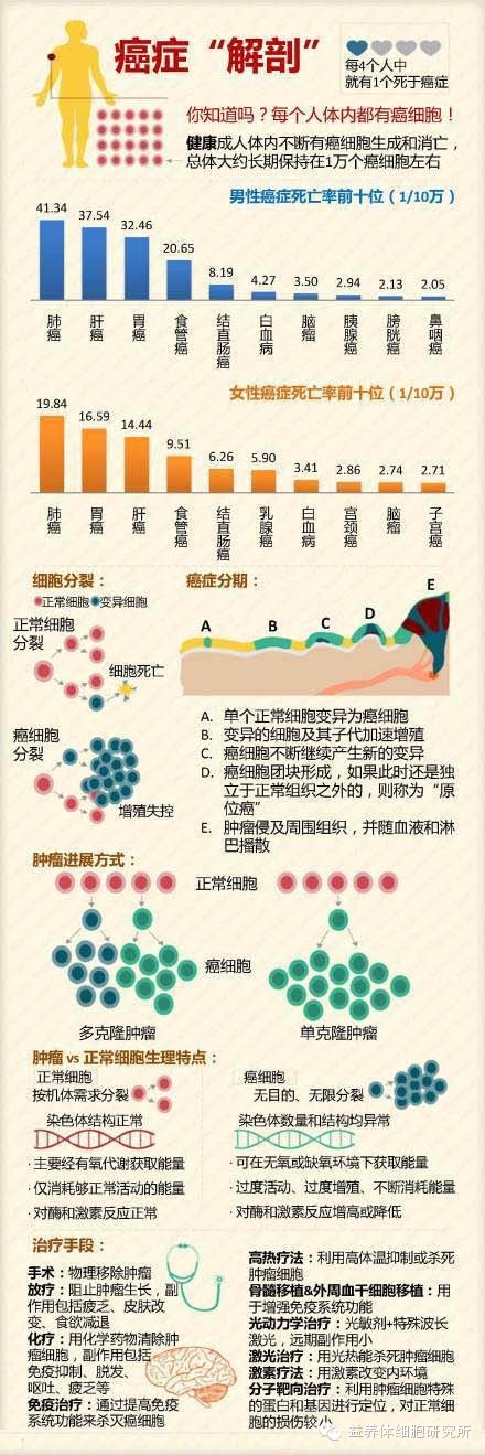 據(jù)統(tǒng)計,任何健康的人,每天都有6,000到10,000個以上的變異細胞產(chǎn)生;它們會因為內(nèi)外因(惡劣的環(huán)境因素、不良生活習(xí)慣、不健康的飲食等等)或快或慢的積累繼續(xù)變異成癌細胞。當(dāng)免疫力變?nèi)醪荒茯?qū)除癌細胞時,癌細胞將開始增殖,形成腫瘤!